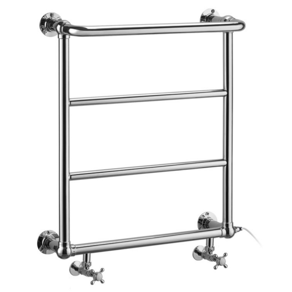 Measuring 642mm in width and 720mm in height, the rectangular frame of this wall mounted towel radiator houses three cylindrical bars and is topped with an additional curved towel rail, which extends beyond the bars beneath it such that you can dry your bath towel without restricting the other heating elements.
