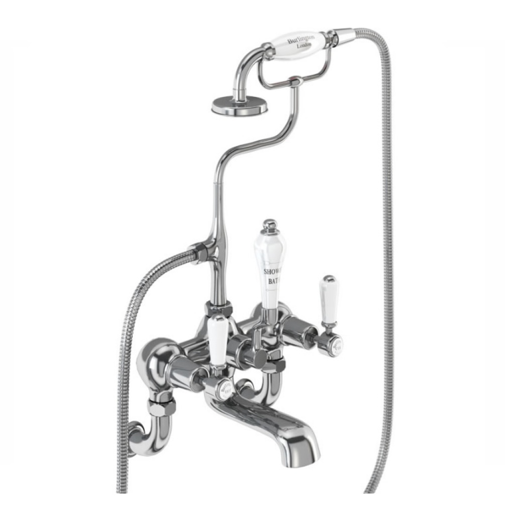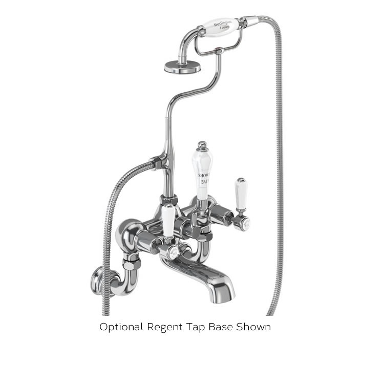 This wall mounted bath shower mixer features a choice of standard or raised tap bases, creating an even more elegant fixture in your space, especially with white indices and a practical diverter lever.