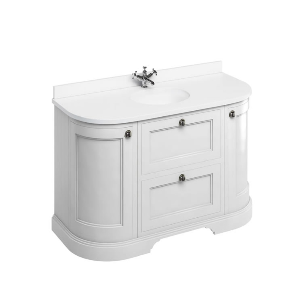 Available with three handles and two worktop finishes, the Minerva 1340mm Curved Worktop & Matt White Freestanding Vanity Unit with Drawers is a gorgeous storage solution from the Burlington range that would cement the aesthetic of any period inspired bathroom.