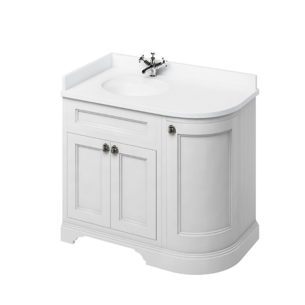 Burlington Minerva 980mm Left Handed Curved Worktop & Matt White Freestanding Vanity Unit
