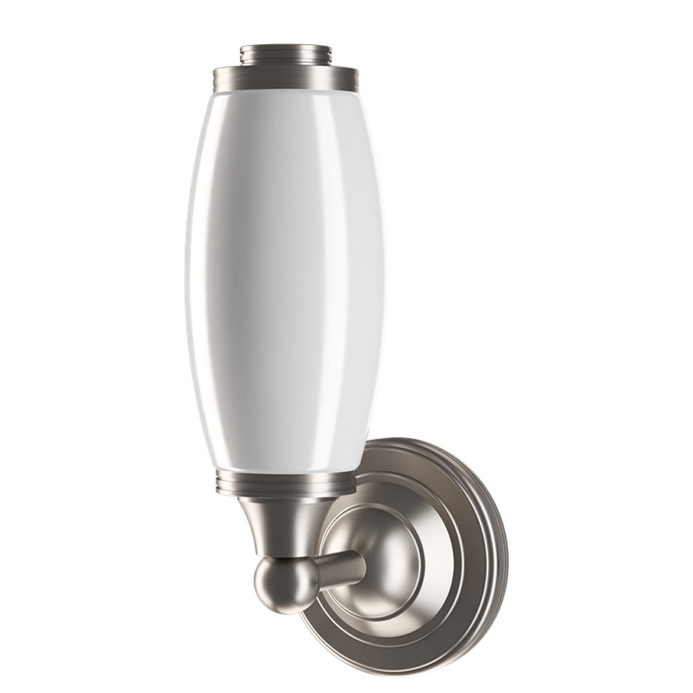 This beautiful wall light features a round base that brings through the soft, calming style of classical design eras, especially when combined with the ornamental ball at the base of this lamp. The Brushed Nickel finish adds to the wow factor to the design, projecting a true traditional look. The delicate details flourishes above and below the timeless shade, making it the perfect lighting solution for any traditional bathroom design. Complete with an elongated frosted glass shade, this lamp brings sophistication and elegance to your home.