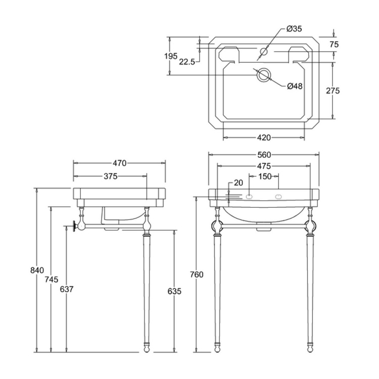 With the option of one, two or three tap holes, the Victorian 560mm Basin & Chrome Washstand is a luxurious piece of sanitaryware from the Burlington range that would make a statement in any modern bathroom trending towards a traditional aesthetic.