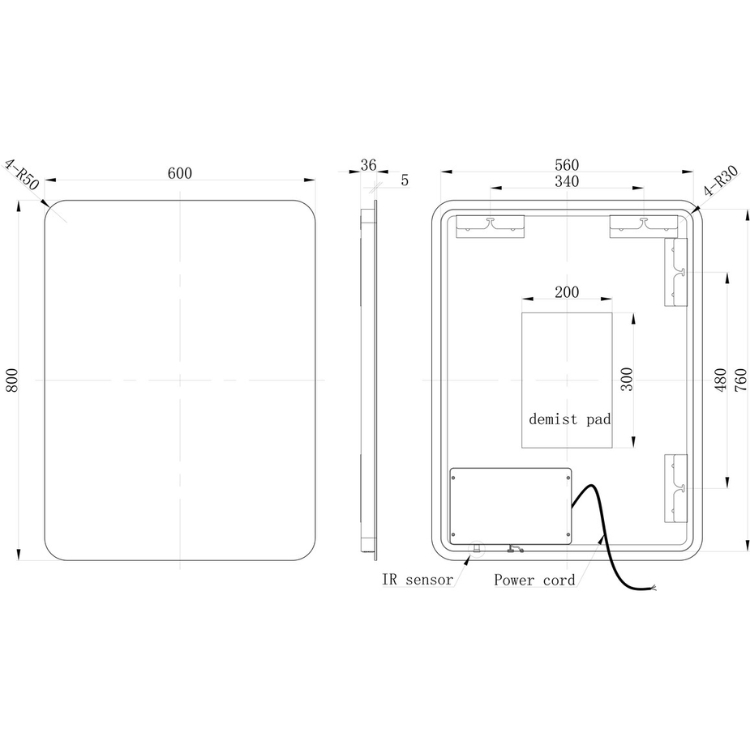 The curved corners of this rectangular mirror, which measures 600mm in width and 800mm in height, are accentuated by its backlit colour changing LED lights that are controlled via the infrared sensor switch concealed beneath its bottom right corner.