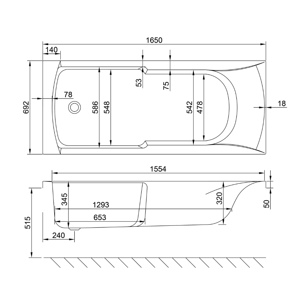 This spacious single ended bath measures 1650mm long, 700mm wide, and has a height of 515mm, making it a versatile fit for various bathroom styles. Its sleek rectangular shape features gently rounded edges at the bathing end, creating a soothing and inviting atmosphere. Meanwhile, the waste end adopts a sturdier square design, enhancing stability and allowing the bath to function as a shower bath when paired with compatible bath screens.