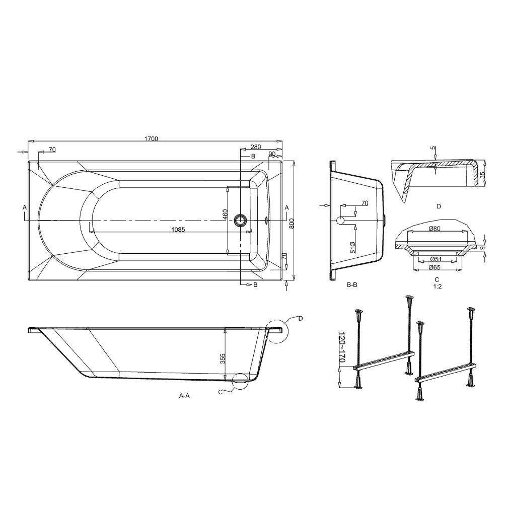 - Dimensions: L: 1700 x W: 800 x H: 370mm