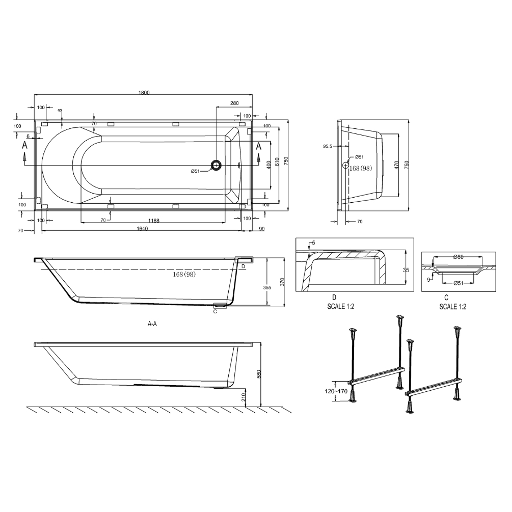 - Dimensions: L: 1800 x W: 750 x H: 370mm