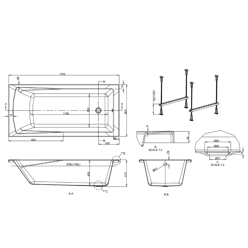 - Dimensions: L: 1700 x W: 800 x H: 415mm