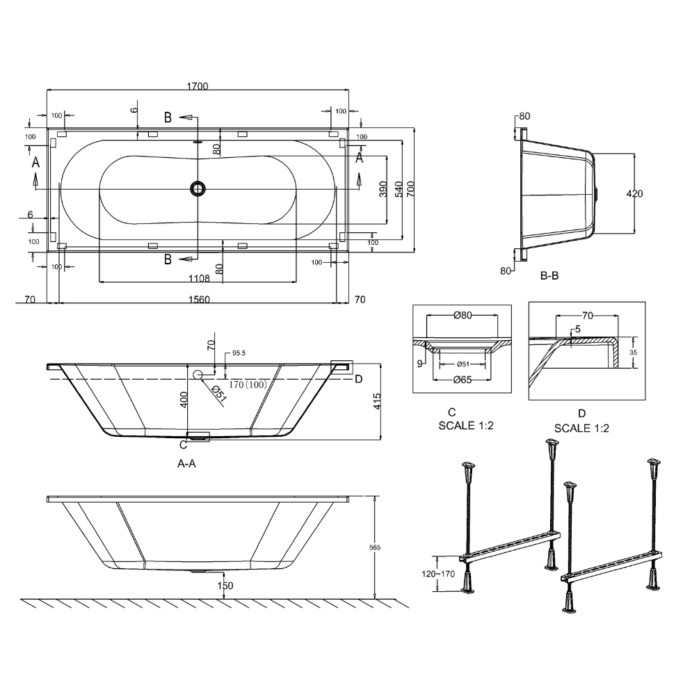 - Dimensions: L: 1700 x W: 700mm x H: 415mm