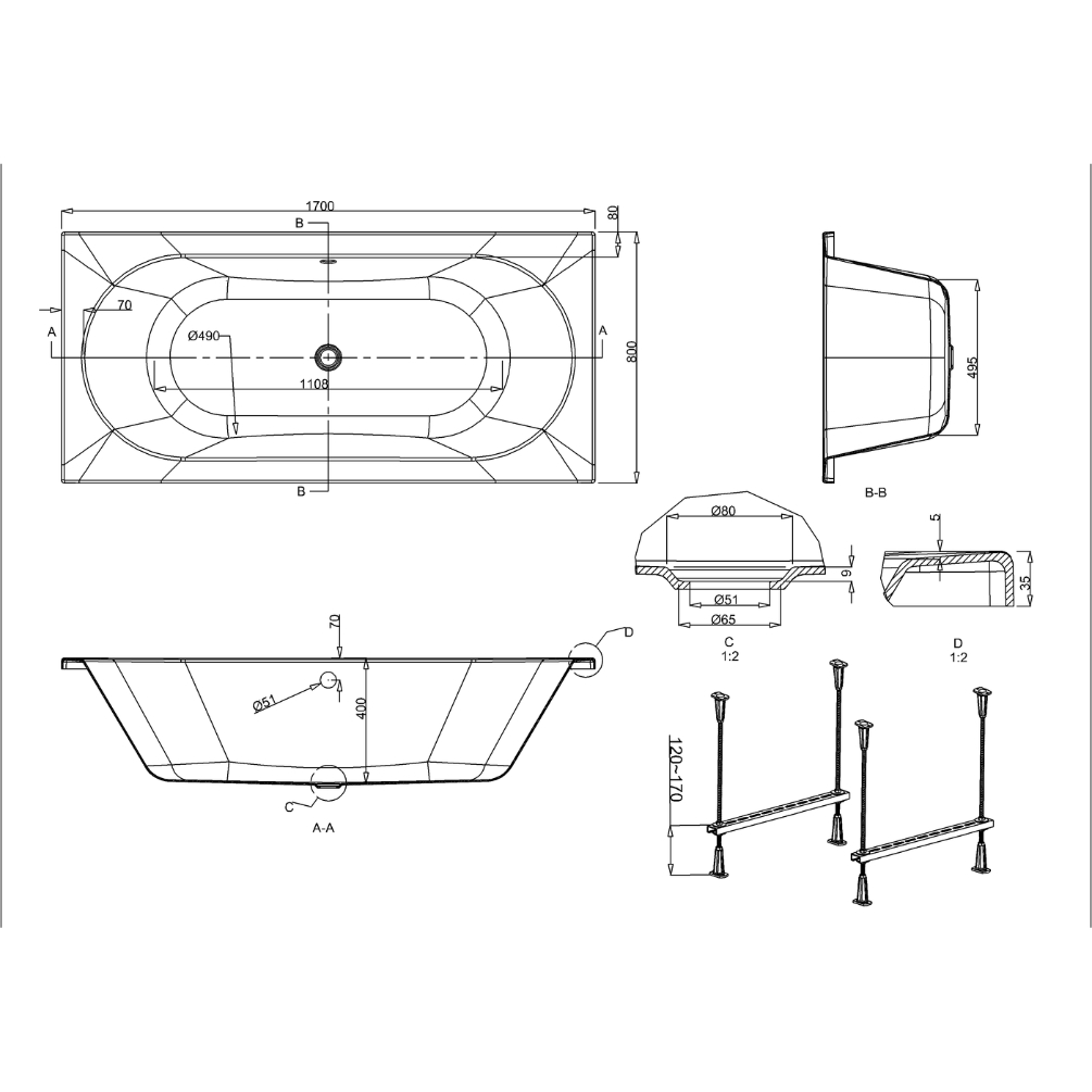 - Dimensions: L: 1700 x W: 800mm x H: 415mm
