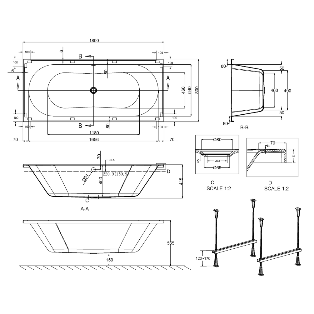 - Dimensions: L: 1800 x W: 800mm x H: 415mm