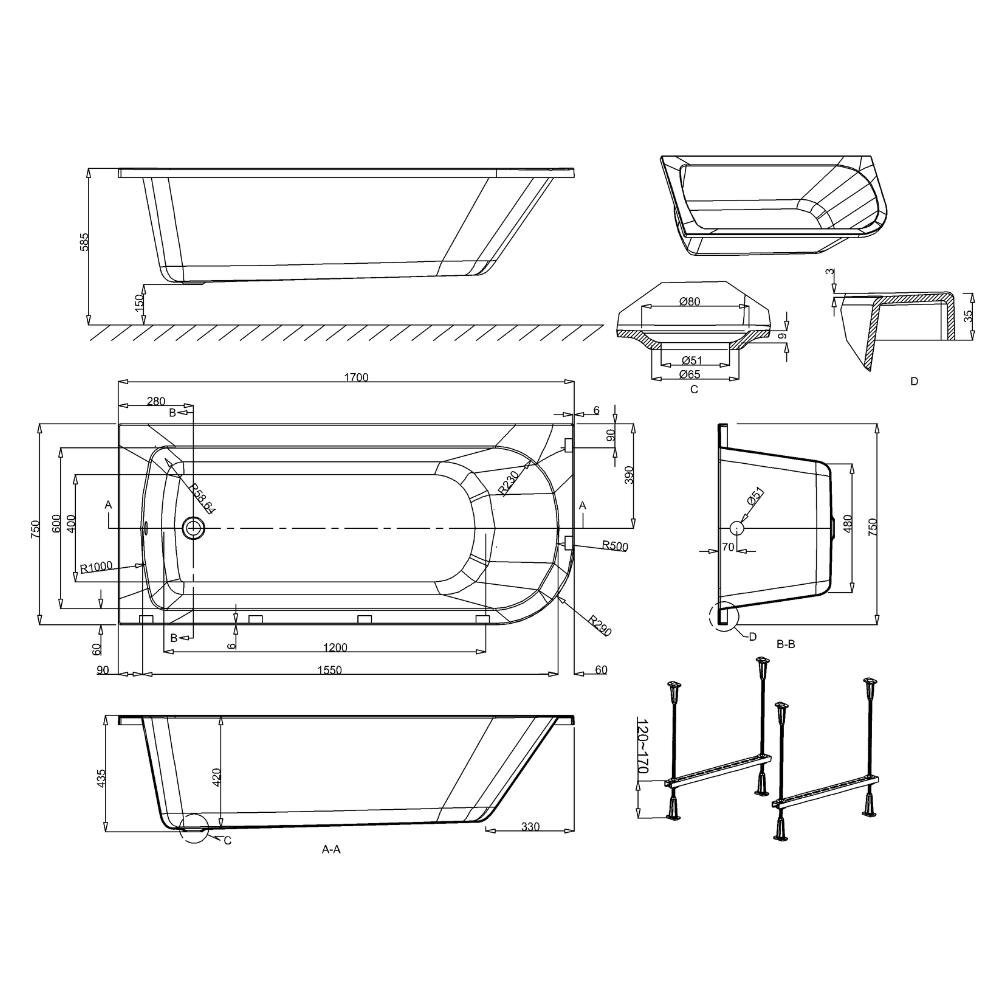 - Dimensions: L: 1700 x W: 750mm x H: 435mm