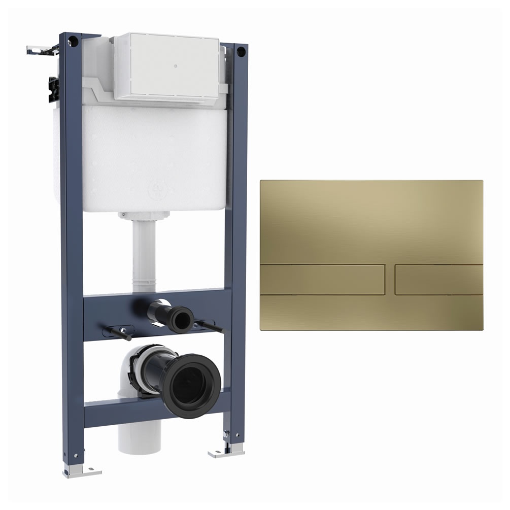 Designed for concealed installation, this wall-hung toilet frame supports your WC pan with reliable fortitude. The frame is manufactured from robust steel with adjustable feet, and includes an inbuilt cistern with customisable dual flush function. You can choose between 6/4 litre or 4.5/3 litre volumes, depending on how much water you're looking to save over the course of sustained use. The cistern also features sound-deadening pads, along with an elegant Crosswater Venue brushed brass flush plate.