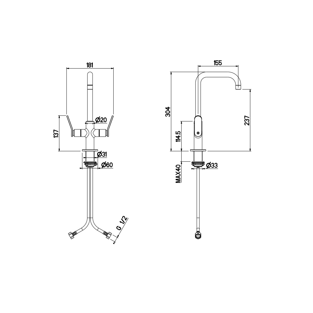 This tall basin mixer tap embraces rounded geometry across its entire form. The substantial circular base sits firmly on your basin deck, anchoring a soaring arched spout that extends with impressive height, perfect for accommodating diverse basin types and configurations. Two commanding lever handles position themselves on either side of the base, their flat, vertical design elements fanning outward with sculptural intent. Knurled texturing adorns the spout's tip and handle bases, creating visual intrigue that underscores the collection's raw industrial spirit.