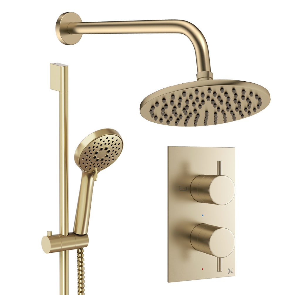 Rich with warm, glowing detail, this thermostatic shower set features robust brass construction with a shimmering brushed veneer. It consists of a concealed two-way valve, a choice of elegant shower heads, and a multifunctional slide rail shower with a wall outlet and hose. The overhead shower comes in a 200mm size by default, delivering a strong and invigorating downpour. However, if preferred, you can opt for a larger 300mm model to really lock in those luxury vibes.