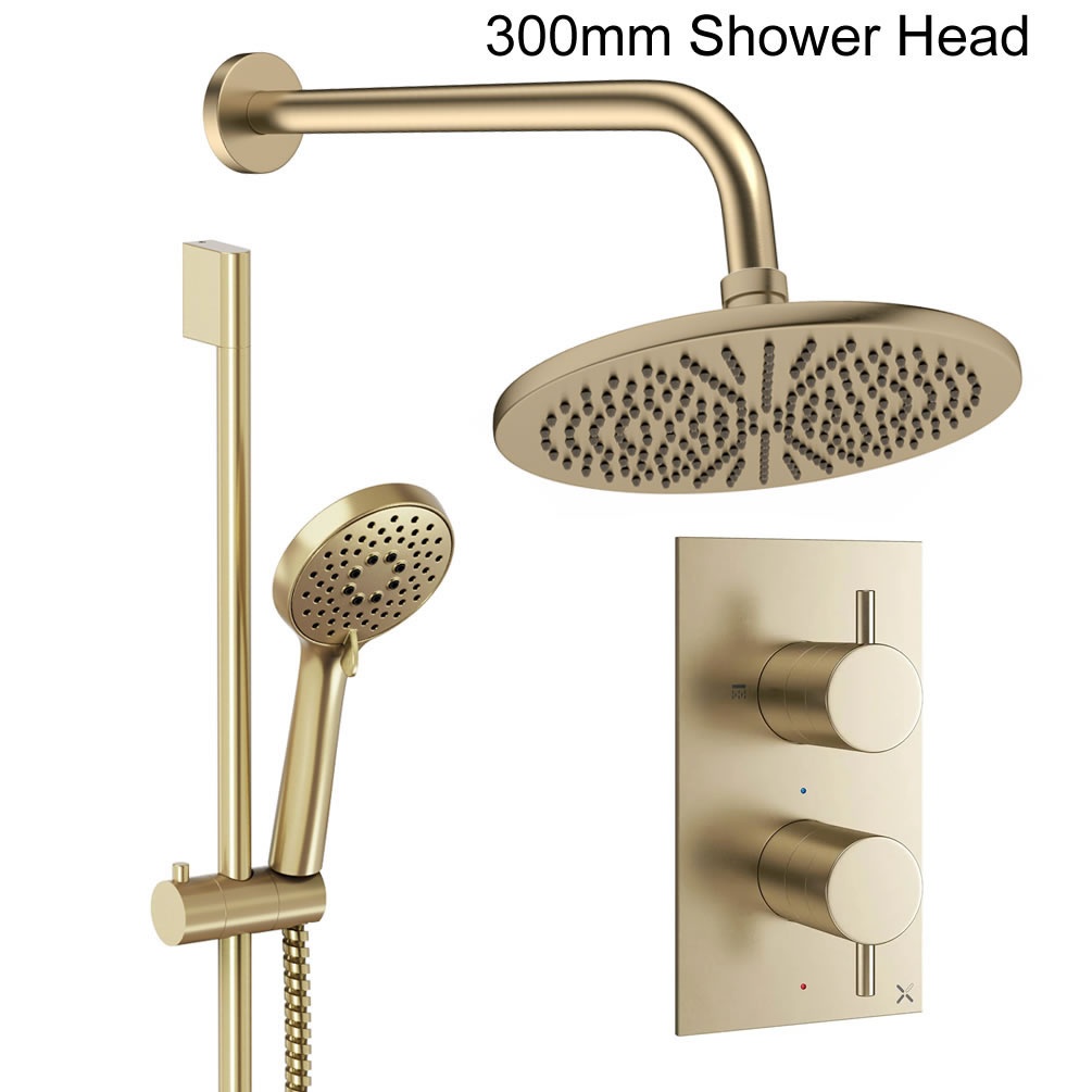 Rich with warm, glowing detail, this thermostatic shower set features robust brass construction with a shimmering brushed veneer. It consists of a concealed two-way valve, a choice of elegant shower heads, and a multifunctional slide rail shower with a wall outlet and hose. The overhead shower comes in a 200mm size by default, delivering a strong and invigorating downpour. However, if preferred, you can opt for a larger 300mm model to really lock in those luxury vibes.