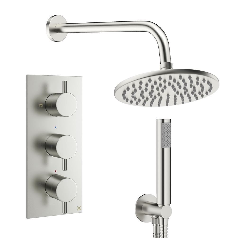 When precision rinsing is required, simply activate the smaller shower handset to douse those awkward spots. Better still, the mixer valve's three-handle build means both shower heads have separate water flow control handles. You can switch on the handset without diverting water away from the main shower head, enabling simultaneous use. The valve itself is streamlined and easy to use, with integrated thermostatic technology for guaranteed anti-scald protection. Furthermore, each item in this set is cast from durable brass with a raw, ultra-modern brushed nickel finish, bringing visual depth and character to your bathroom.