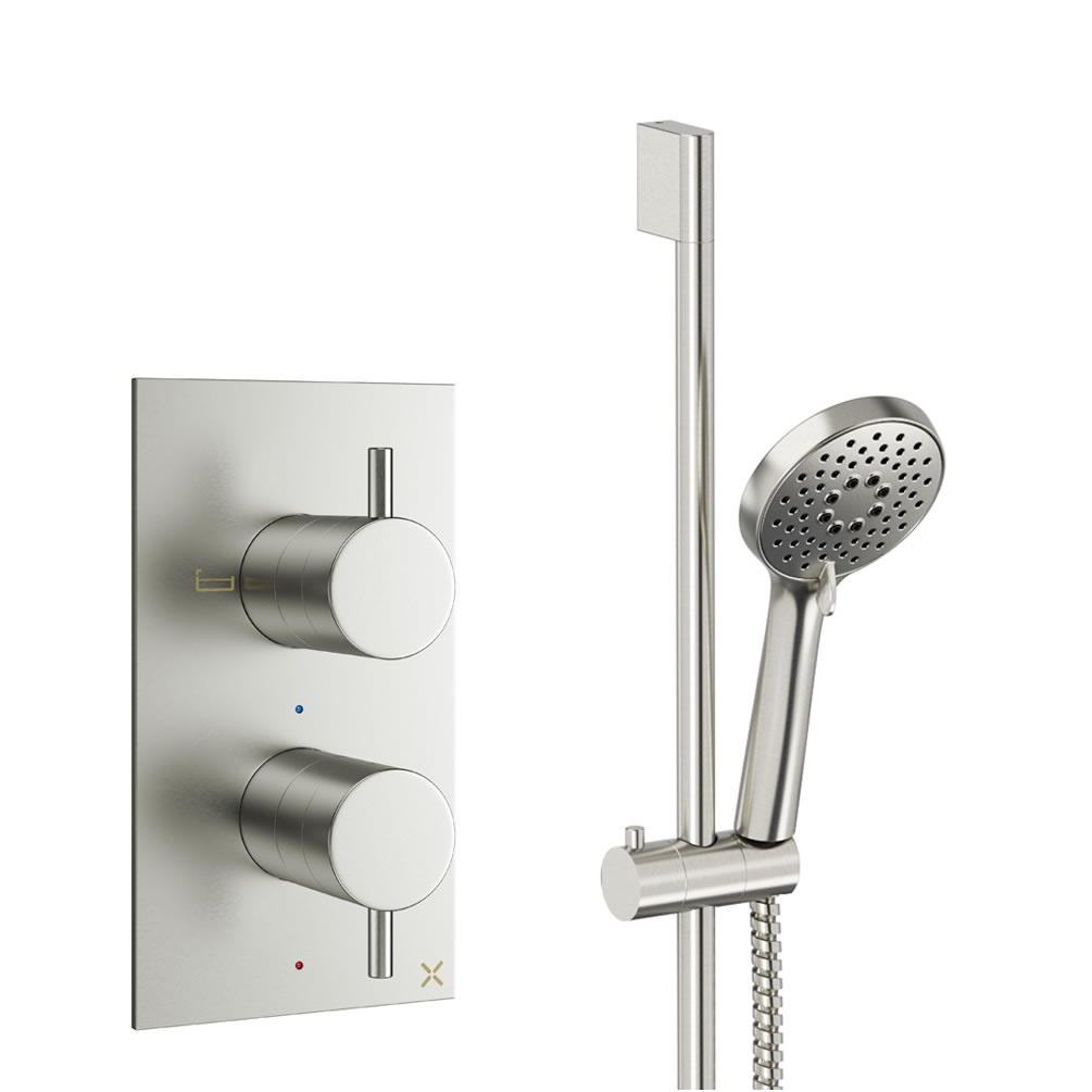 Swathed in a cool, rugged brushed nickel finish, this thermostatic shower blends in beautifully with any contemporary bathroom theme. The concealed shower valve is expertly engineered for comfort and user protection, maintaining your selected temperature for the duration of your shower. It compensates for pressure fluctuations throughout your water supply, which means no scalding shocks popping up to ruin your day.