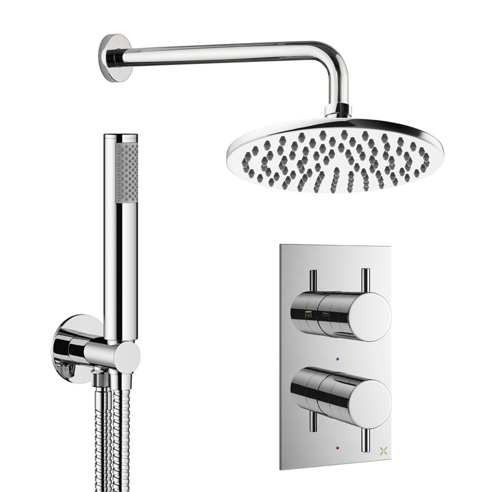 Gleaming with crisp, mirror-like chrome, this thermostatic shower fits nicely into various contemporary bathrooms. It's particularly well suited for minimalist spaces, where visual clarity and free-flowing light come highly prized. In terms of inclusions, this pack comprises a concealed dual outlet shower valve, a shower handset with its own wall outlet, and a choice of 200mm or 300mm round rainfall shower heads.