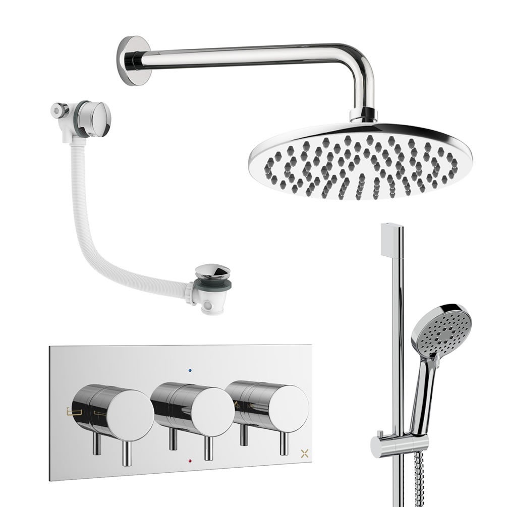 Clad in gleaming, razor-sharp chrome, this system offers crisp and impressive visuals to enhance your bathroom aesthetic. It's the complete shower-bath package, sporting three outlets to make sure that your every need is met. The first outlet takes the form of a sleek, beautifully sculpted rainfall shower head, equipped with a matching wall arm and available in 200mm or 300mm sizes. The second is a slide rail kit, featuring an adjustable bracket and three unique spray settings. The final outlet connects to an overflow bath filler and waste, providing swift, unhindered filling and draining.