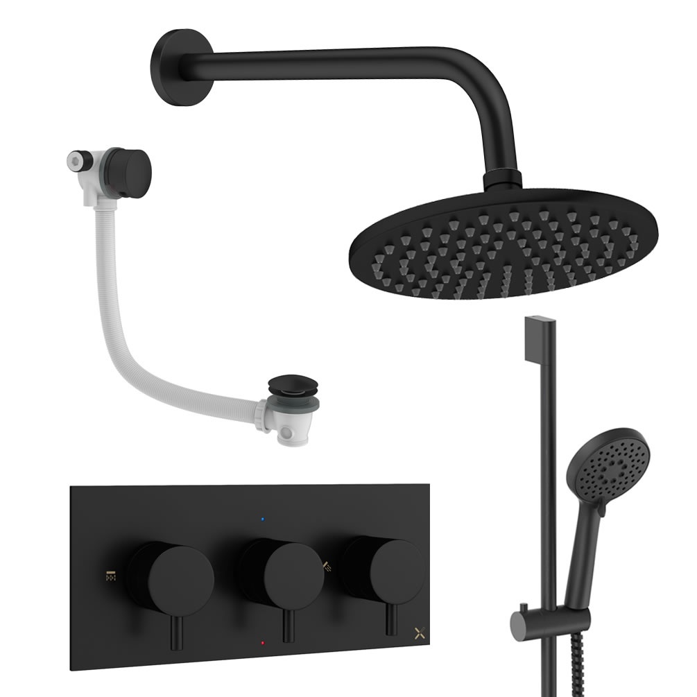 A comprehensive system, this Crosswater pack features two showering accessories plus an overflow bath filler, with a powerful thermostatic mixer valve pulling the strings behind the scenes. The immersion-plated black finish encases the inner brass, protecting the complex engineering and creating a striking sense of depth.