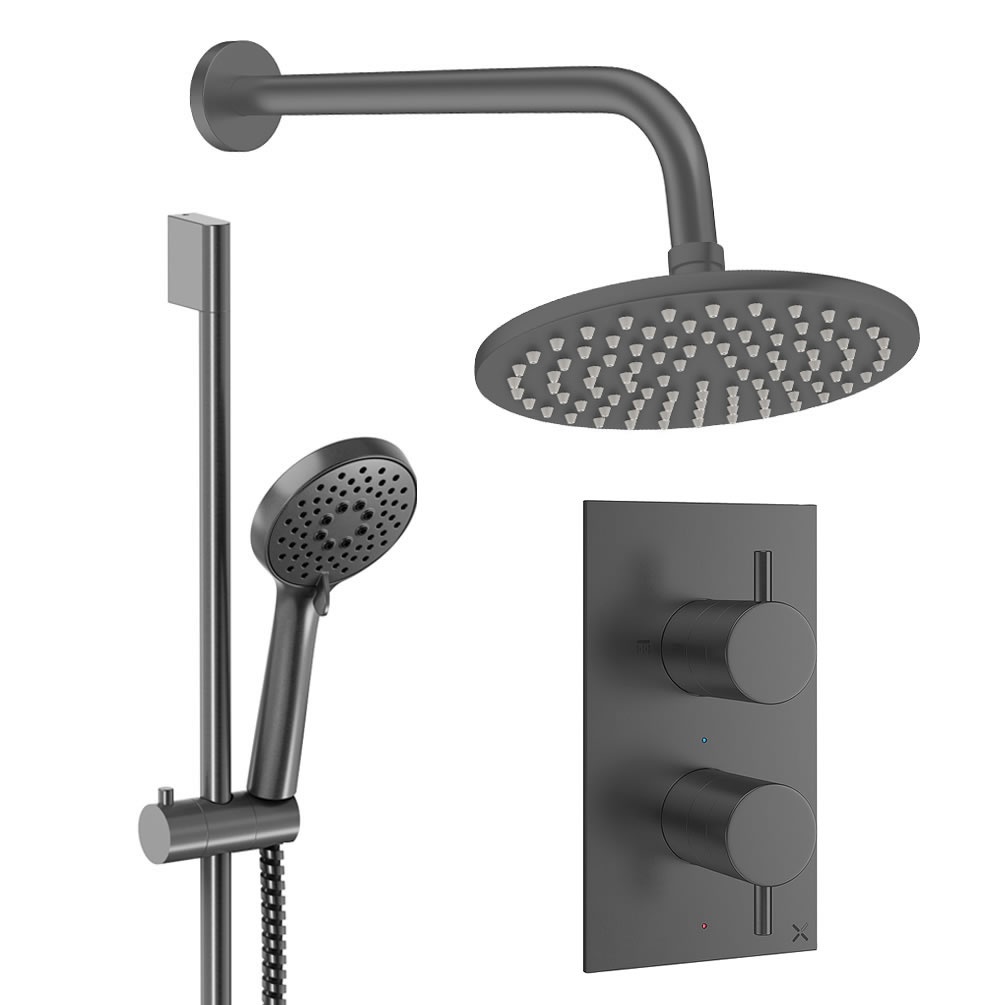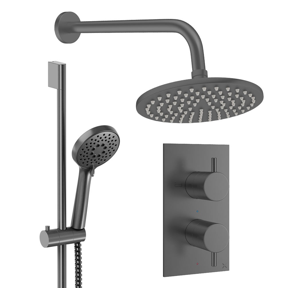 Built by Crosswater, this thermostatic shower is cast from durable brass and finished in a PVD gunmetal coat. It's a robust and reliable dual-outlet system, comprising a luxurious rainfall shower head supported by a multifunction slide rail shower kit. The former is available in 200mm and 300mm variants, while the latter features an adjustable holder bracket and three separate spray pattern settings.