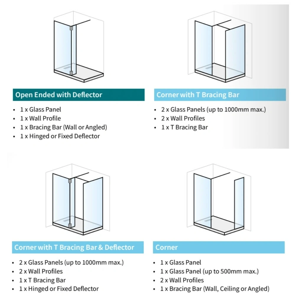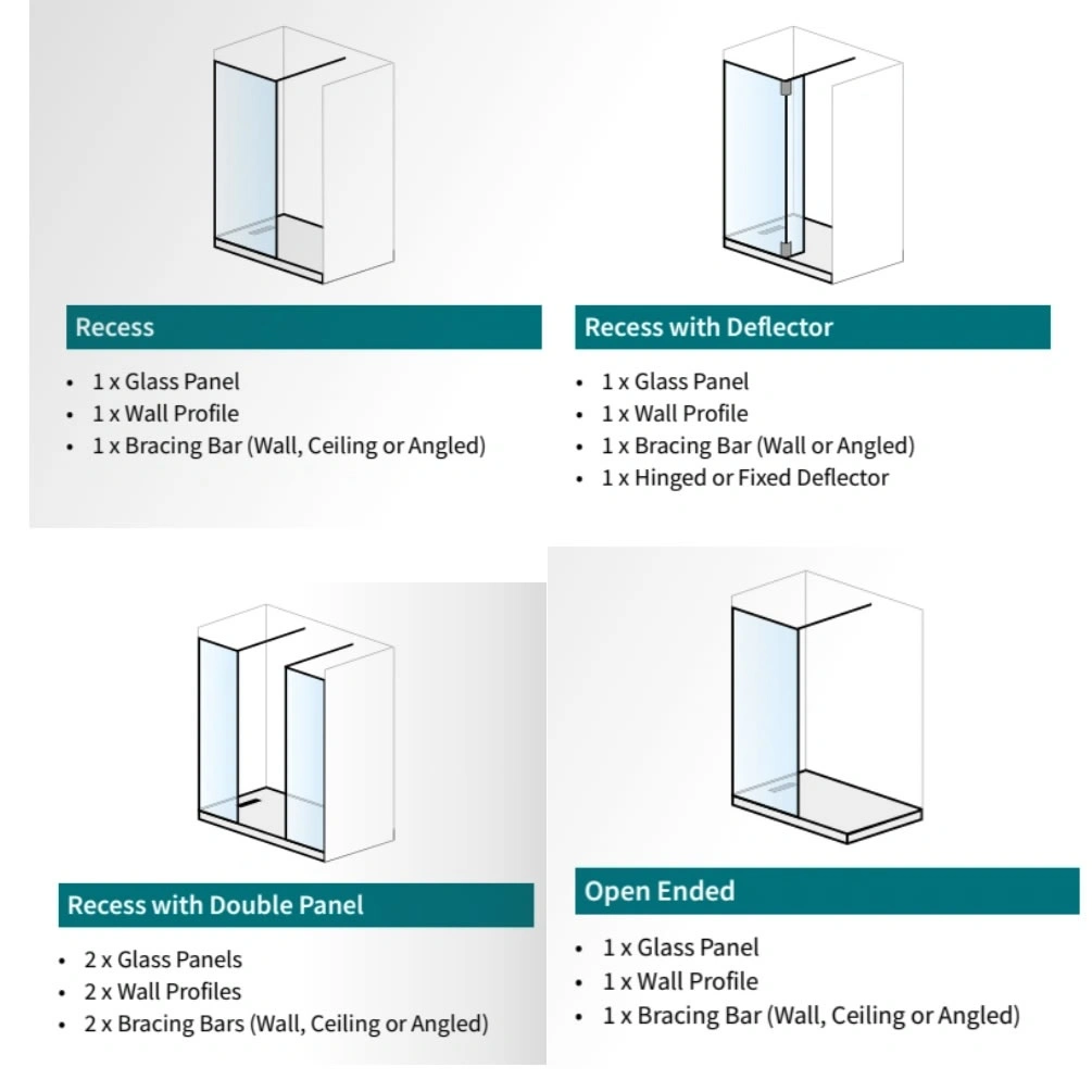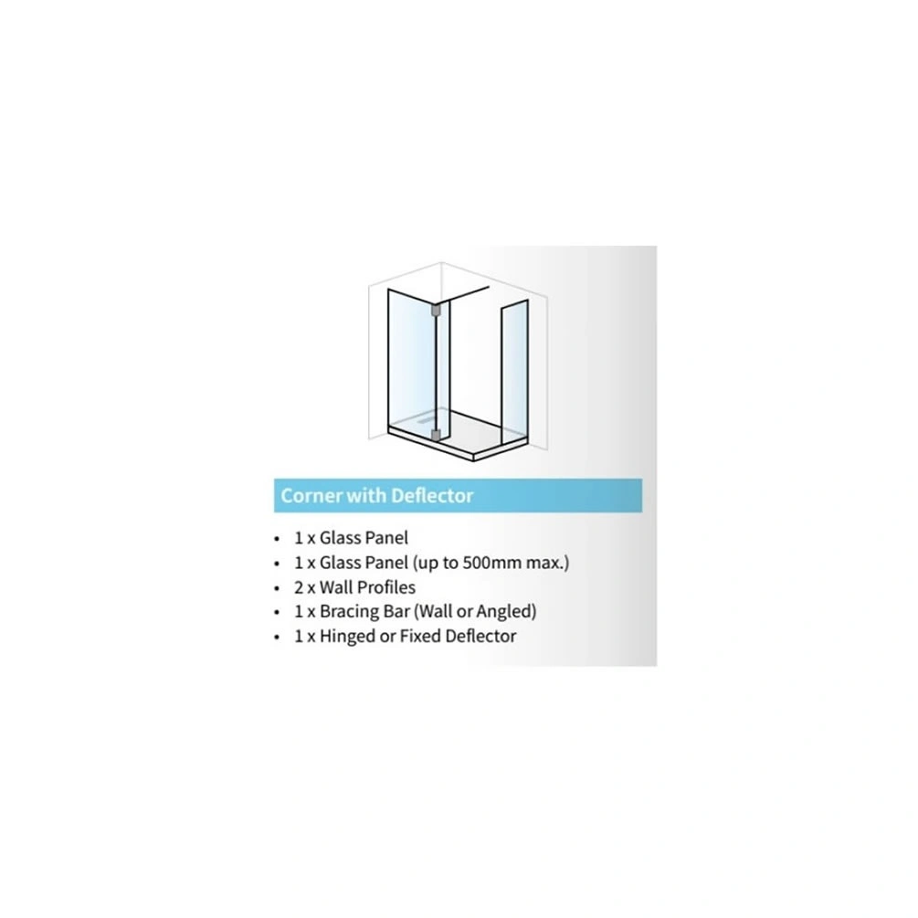 This screen can be fitted either on its own or in conjunction with a secondary panel, forming a complete walk-in enclosure. A deflector panel can also be added, with both fixed and hinged options available. There is a wide range of possible configurations, so feel free to browse the images above to find the perfect setup for your particular bathroom.