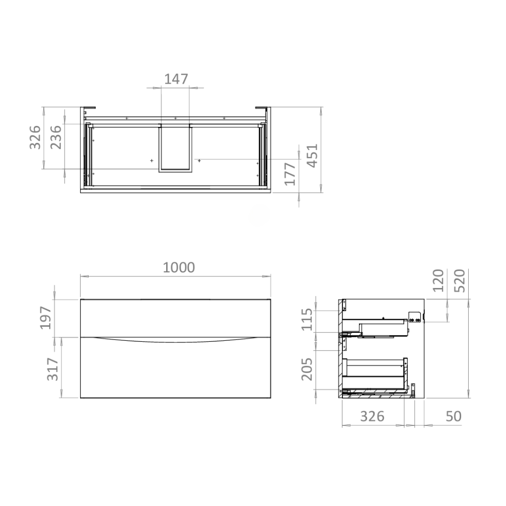 The two drawers that comprise this wall hung vanity unit, which measures 1000mm in width and 520mm in height, eschew conventional furniture handles in favour of integrated handles hidden at the base of the upper drawer and along the upper edge of the drawer below. Gripping either drawer by its integrated handle allows you to slide them open, gaining access to the abundance of space inside. The dimensions of the bottom drawer are perfect for storing larger bathroom essentials, such as fresh towels, toilet rolls or cleaning products, while the partitioned top drawer is ideal for separating your toiletries and cosmetics from those used by other members of your household.