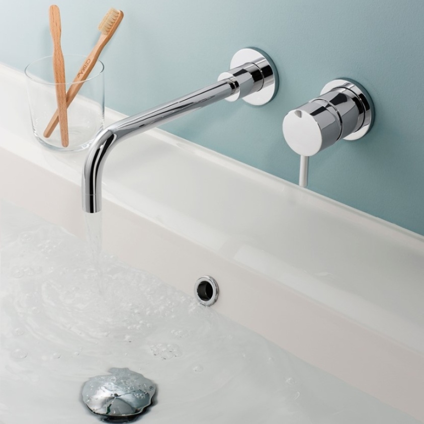 Measuring 64mm in height and 210mm in its projection, the cylindrical spout of this wall mounted basin mixer curves downward, giving the product a gentle elegance while directing its flow into your basin.