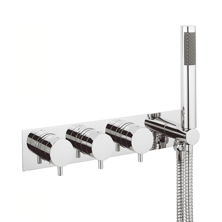 Measuring 342mm in width and 67mm in height, the rectangular backing of this thermostatic shower valve features an integrated bracket which holds its handset shower, in addition to its three cylindrical lever handles, a signature of the Kai Lever collection.