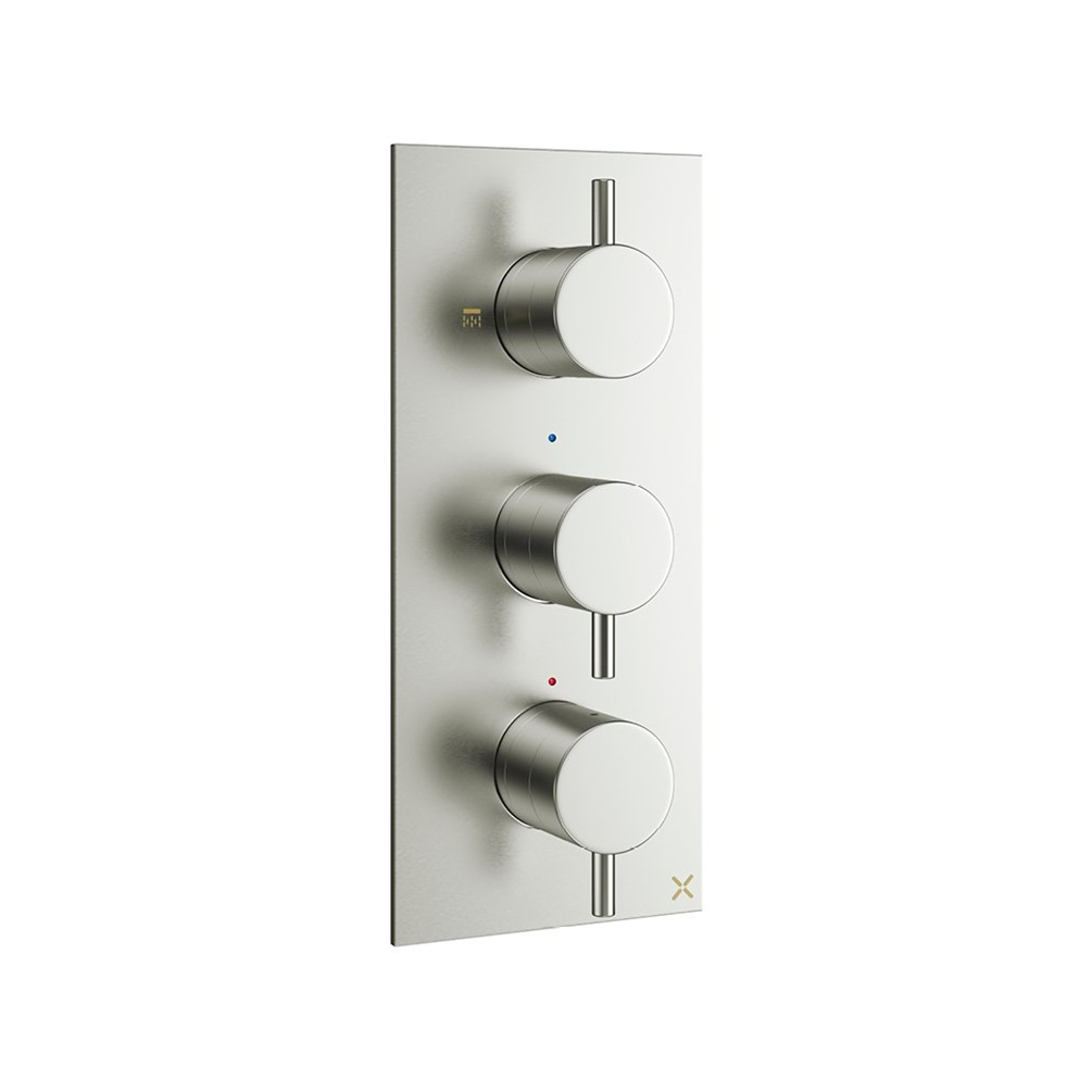 Defined by its three-handle build, this thermostatic shower valve gives you individual control of both available outlets. It's the perfect system for your bathing setup, fully compatible with your choice of shower heads, handsets and slide rail kits.