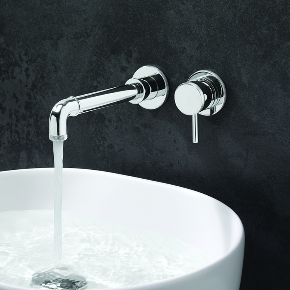 This wall mounted tap features a chrome finish with striking, knurled details and a simple lever handle that would suit any modern bathroom scheme.