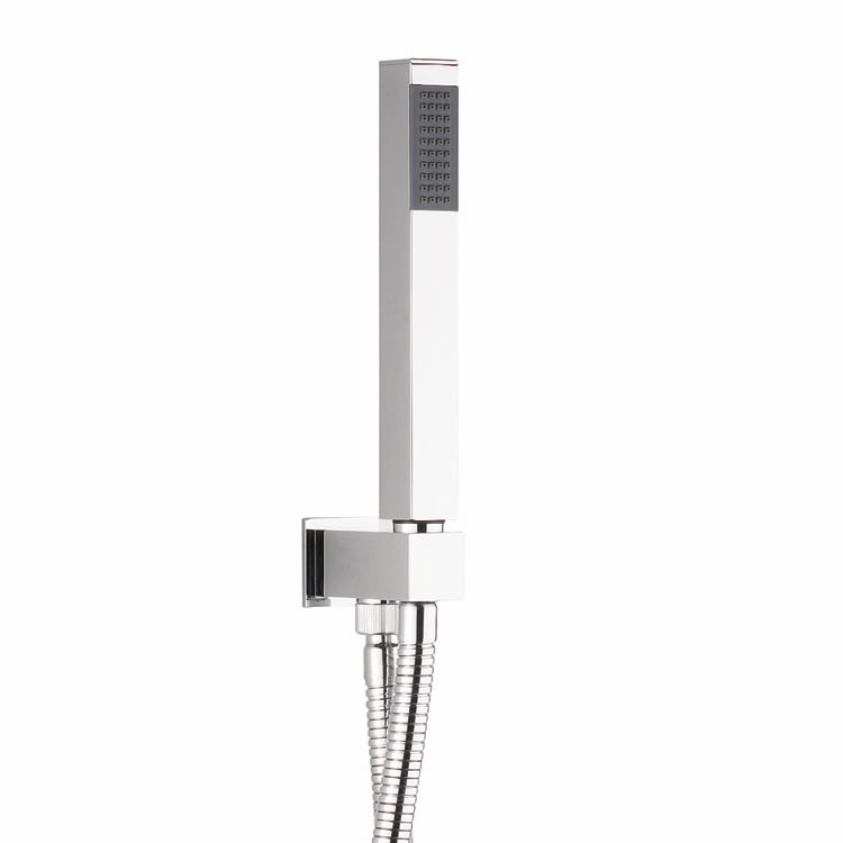 It includes a squared designer shower handset and hose kit, with these connected to a wall outlet and holder, which also serves to hold the handset in place when not in use. It can be used as part of a low pressure system with a minimum pressure of 0.2 bar.