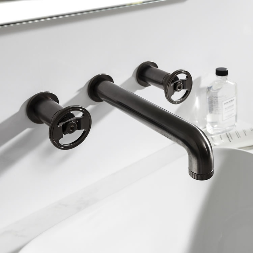 Add the wow factor to your bathroom with the beautifully design Union wall mounted basin set, featuring a unique industrial design with wheel styled handles and a unique brushed finish.