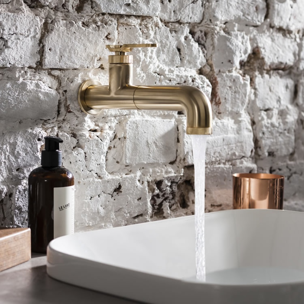 This distinctively designed bathroom basin mixer features an inspired industrial look with a classic brushed brass finish, with a wall mounted design and stylish knurled lever handle that will add a timeless touch to any contemporary bathroom.
