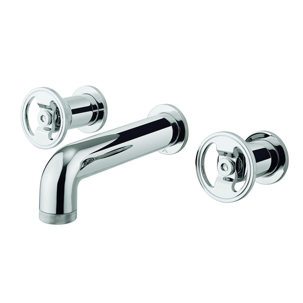 This wall mounted basin mixer features stylish, rounded handles with unique, knurled details and an elegant spout that uses the latest engineering techniques to ensure complete water flow control.