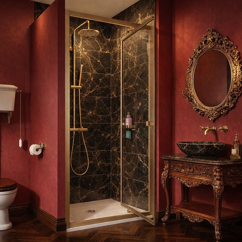 Bathed in the lustrous tones of rich brushed brass, this Dune infold shower door builds a delightfully opulent enclosure. Suitable for a wide array of contemporary bathrooms, this door features a space-conscious pivot hinge that lessens its outward swing. Furthermore, it's capable of mounting atop both shower trays and tiled wetroom floors, with optional side panels available to configure your precise layout.
