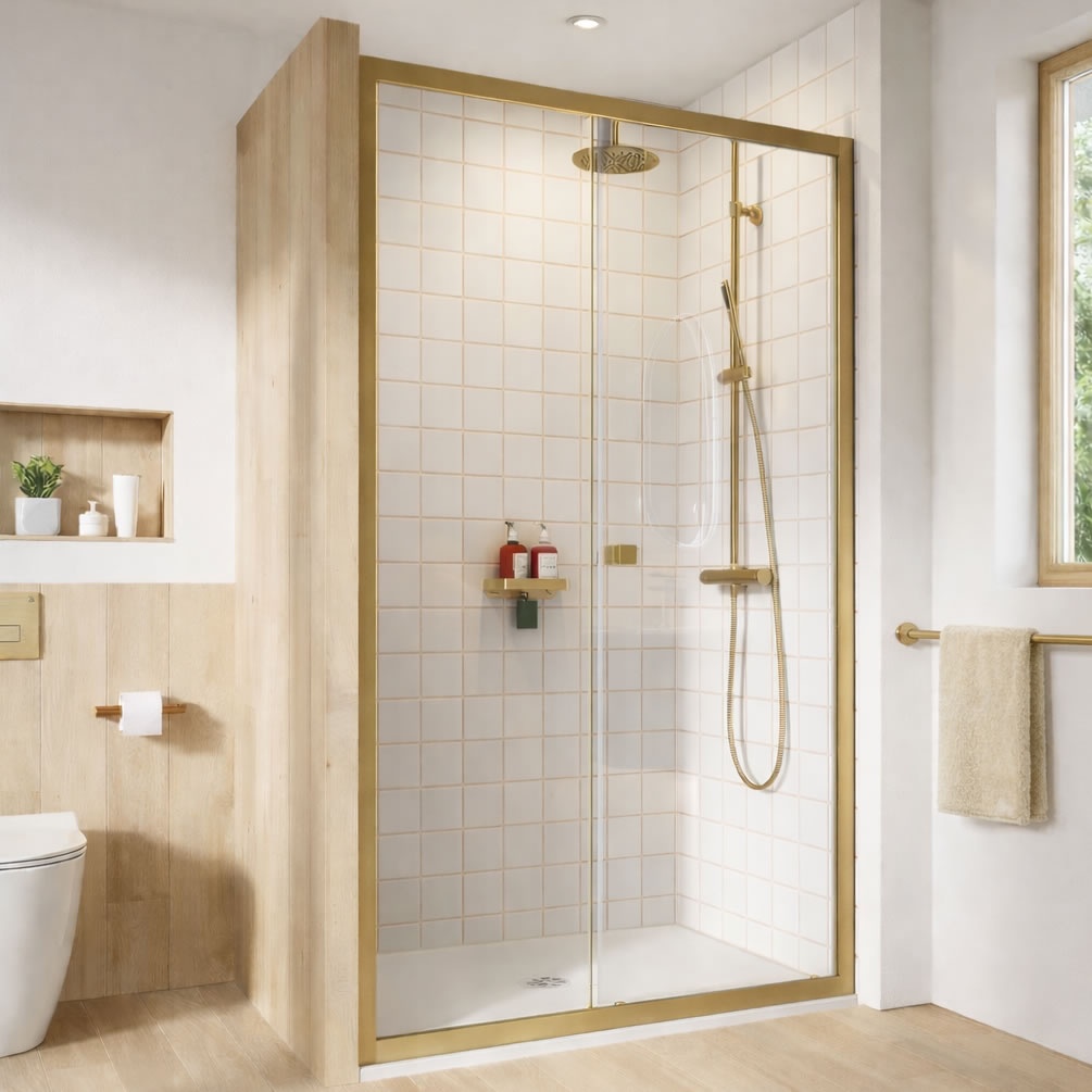 Crafted with care and precision, this sliding shower door creates an elegant threshold to partition your bathroom's shower space. It's comprised of two toughened glass panels bordered by a radiant brushed brass frame, bringing strength and splendour in equal measure. The sliding panel moves with finely calibrated ease, closing securely to shut out the world as you enjoy your showering haven.