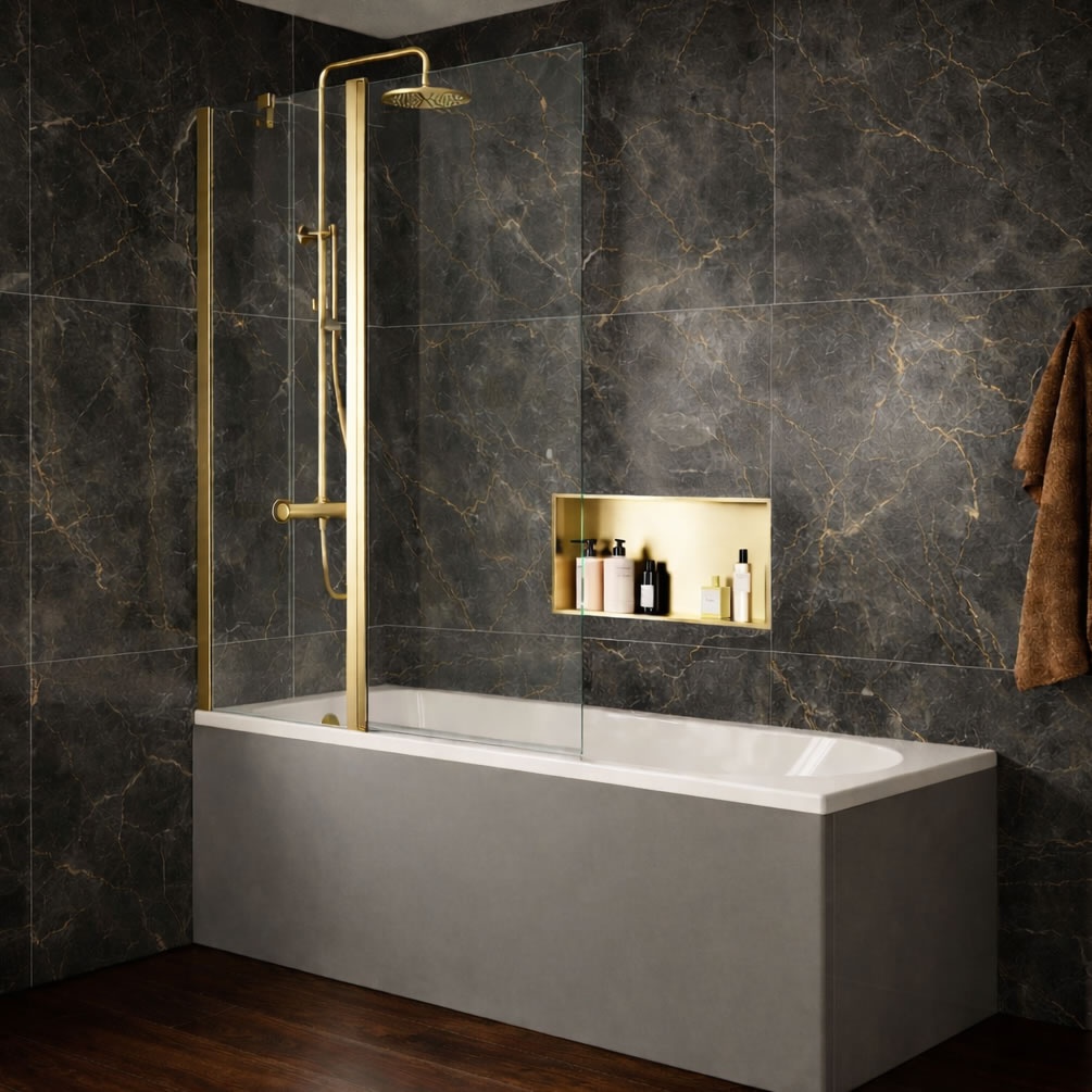 Compatible with most standard square baths, this screen transforms your basic tub into a functional shower enclosure. It ensures that any water from your shower remains firmly where it should, keeping the rest of your bathroom nice and dry. The fixed panel includes a radiant brushed brass profile with a matching bracing bar, while the hinged screen rotates 90° outward for easy access to the bath. Both screens are built from 6mm toughened glass with easy-clean limescale protection, and the entire fixture is reversible for left or right-handed installation.