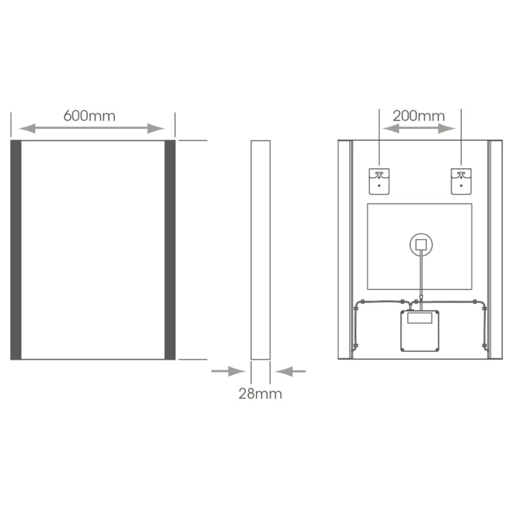 The rectangular mirror face of this illuminated bathroom mirror, which measures 600mm in width and 800mm in height, is bordered by bold strips of colouring changing LED lights running the length of its left and right edges. At the bottom of the mirror face are two touch sensor buttons, which allow you to activate and adjust the settings of these lights.