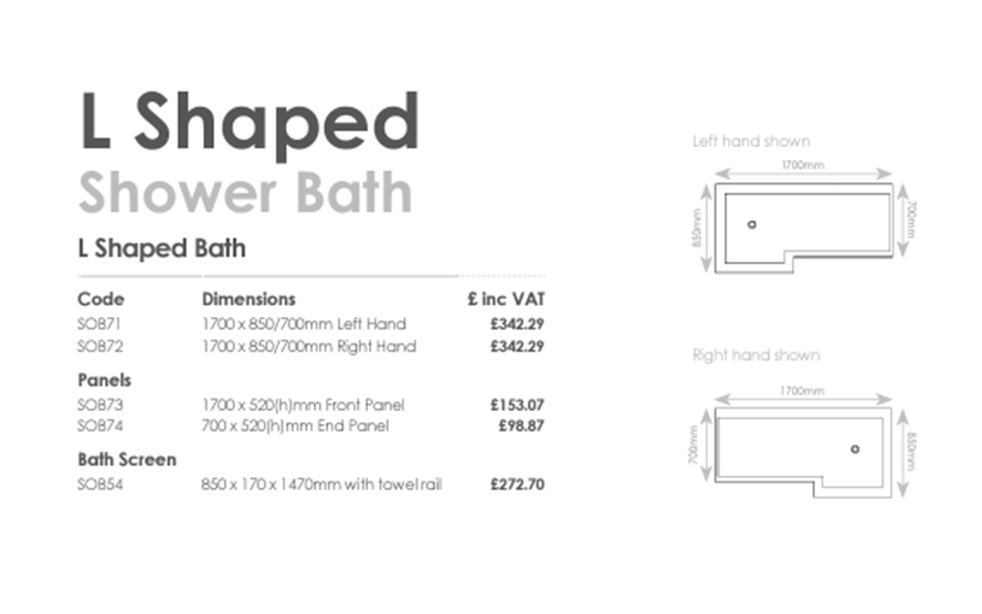 When it comes to handed shower baths that are not rectangular, such as L shaped baths, P shaped baths or other variants, there are often two widths to consider due to one end being bigger than the other. This is why in some brochures or specifications, these baths will often come with two width dimensions written. For example, this may be something like 1700 x 850/700mm, which accounts for the width of each end.