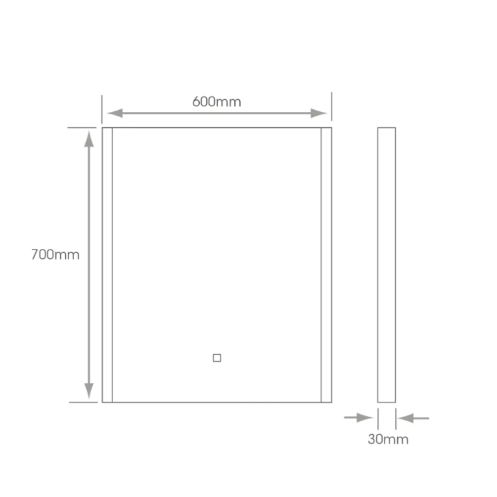 Measuring 600mm in width and 700mm in height, the rectangular face of this illuminated bathroom mirror is lined on either side by two bold strips of colour changing LEDs, which are controlled via the two touch sensors inlaid towards the bottom of the mirror face.