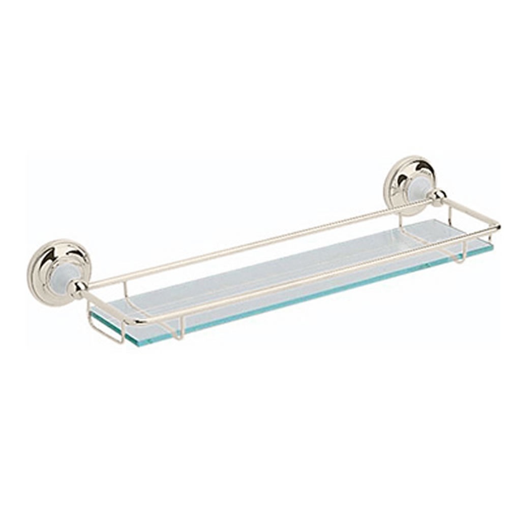 This glass shelf features a practical design with a striking vintage gold finish that would be the perfect finishing touch for any traditional bathroom.