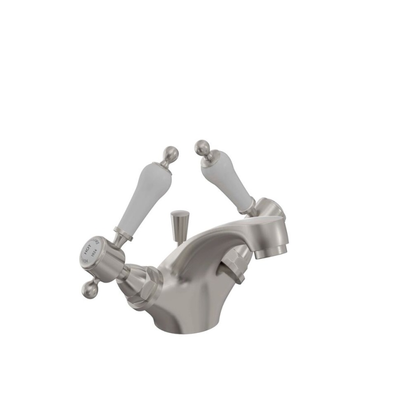 Designed with a single tap hole installation, this Glastonbury mixer makes a versatile choice for various basin styles. Its smooth, curved lines and elegant silhouette creates a timeless look that complements a range of classic and traditional bathroom decors. The beautiful white ceramic lever handles and indices complement the brushed nickel beautifully and the integrated pop up waste adds a practical touch to the design.