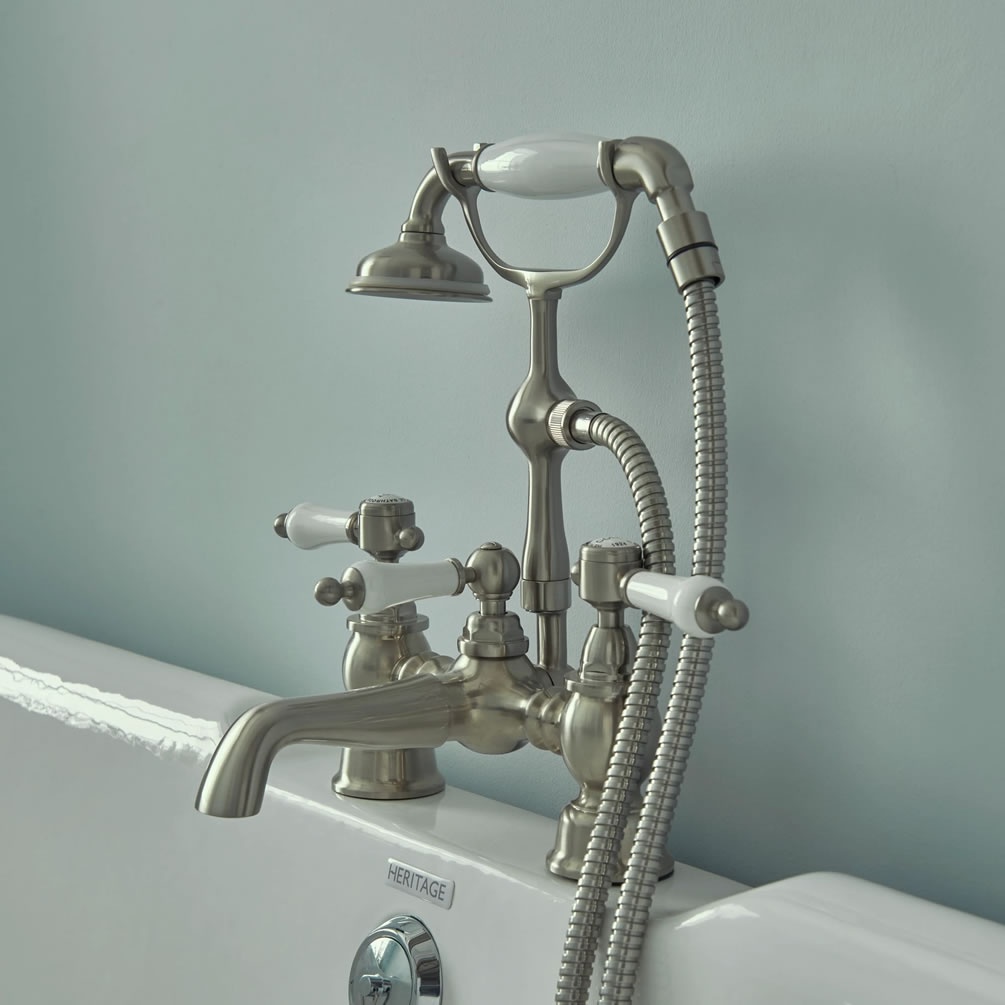Bring timeless style to your new bathroom with the Heritage Glastonbury brushed nickel bath shower mixer, a stunning brushed nickel bath tap that seamlessly combines both elegance and functionality.