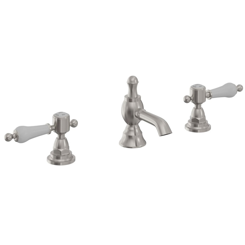 This basin mixer tap features features a three tap hole design with two elegant white ceramic lever handles, these effortlessly operate the water temperature and flow of water. The grand spout oozes opulent styling and the integrated pop up waste adds a practical touch to the overall design. Each control is meticulously crafted to combine both functionality with traditional design, showcasing a stunning brushed nickel finish that reflects light beautifully and makes a beautiful change to standard chrome. The contrasting white handles not only add a touch of modern sophistication but also ensure a comfortable grip for effortless operation.