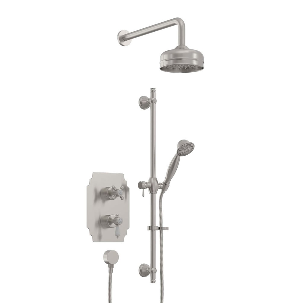 This exquisite shower system comes complete with a dual outlet shower valve that features a timeless design with elegant lever and crosshead handles for ease of use, the white ceramic detail adds a beautiful finishing touch to the design. The thermostatic shower valve ensures a consistent water temperature, providing a safe and comfortable showering experience for you and your family and features elegant lever and crosshead handles for easy operation. The large 6" shower rose provides a luxurious flow of water for an invigorating shower experience and comes complete with matching wall mounted shower arm.
