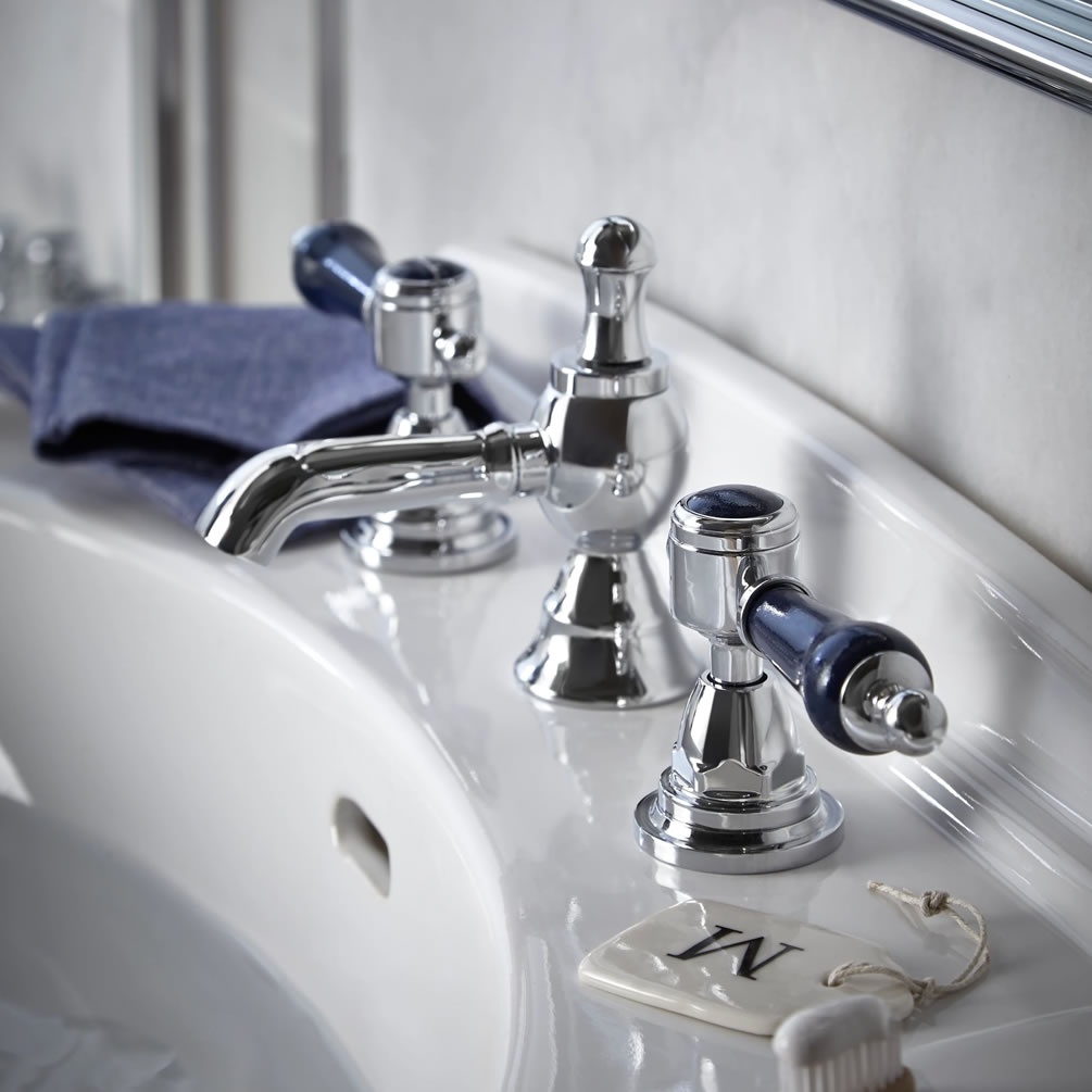 The Heritage Glastonbury Midnight Blue 3 Tap Hole Basin Mixer features a cool classic design with distinctive blue lever handles and indices, a fabulous option for creating a statement in your bathroom.