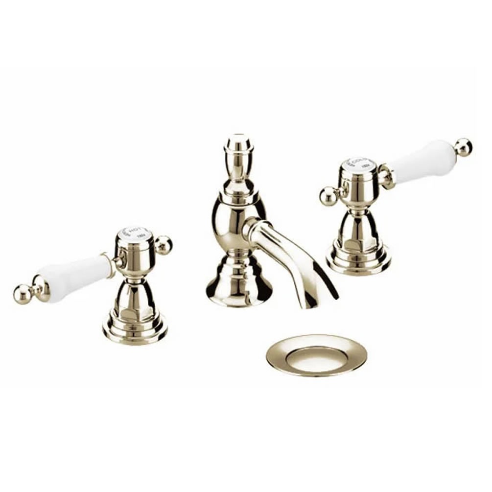 This 3 tap hole basin mixer features a vintage gold finish with an elegant spout and white handles, with unique period details that would suit any traditional bathroom scheme.