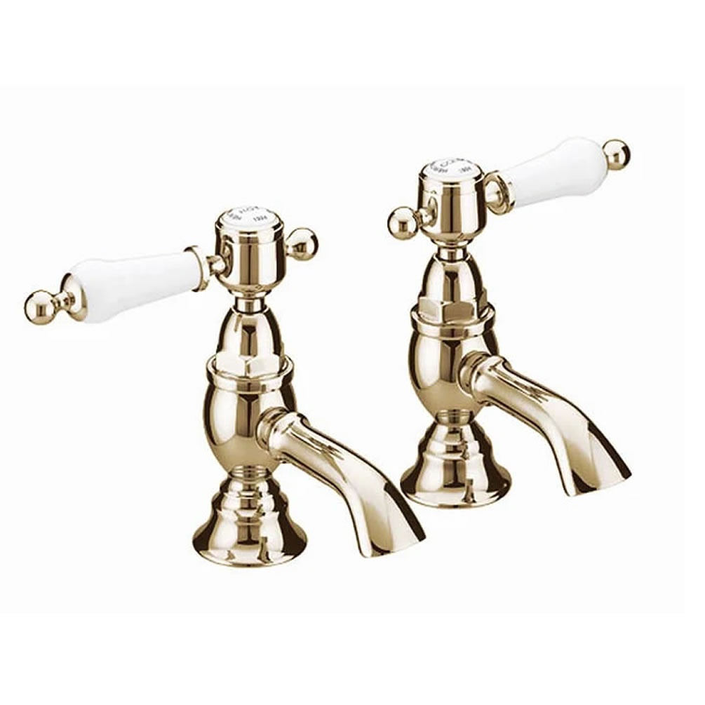 This pair of basin taps feature a Vintage Gold finish with stylish white lever handles and longer spouts that make these ideal for inset basins.
