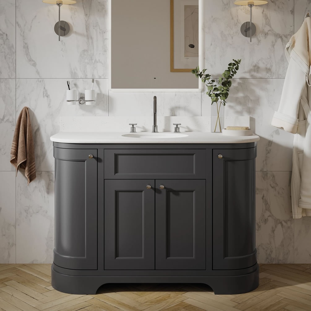 Add a bold statement to your bathroom with the traditionally designed Wilton floorstanding vanity unit from Heritage Bathrooms, featuring a timeless design with a stunning, on trend Graphite finish that will suit a range of period styled interiors.